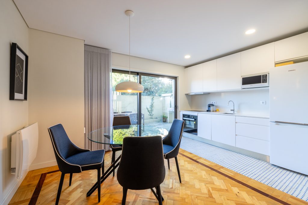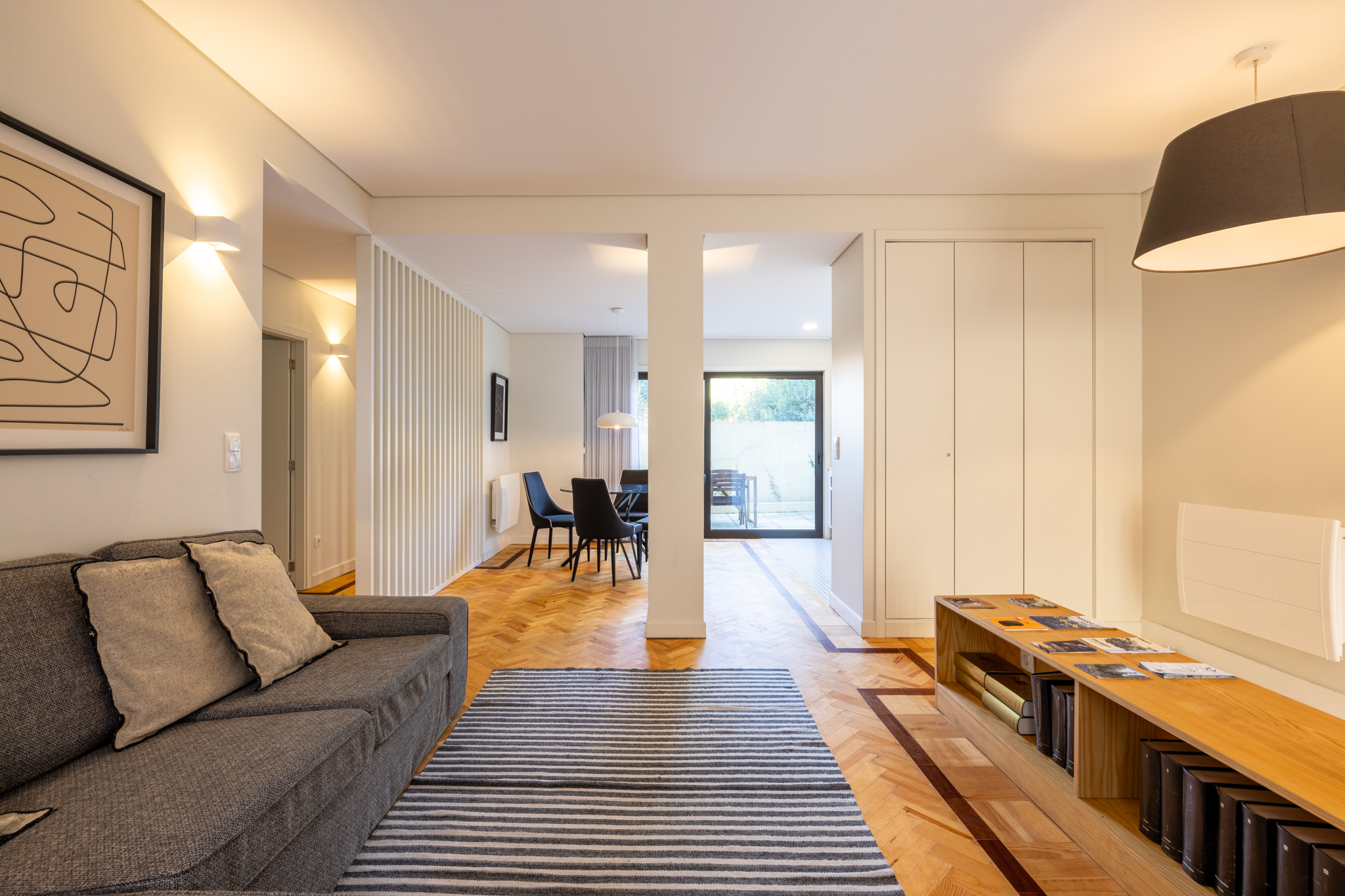 This apartment feels just like a house. It’s on the ground floor, has its own street entrance, and a super cozy terrace at the back. Fully renovated, it’s in a charming 1950s building on Rua Miguel Bombarda, also known as the “Art Galleries Street” or “Arts District.”