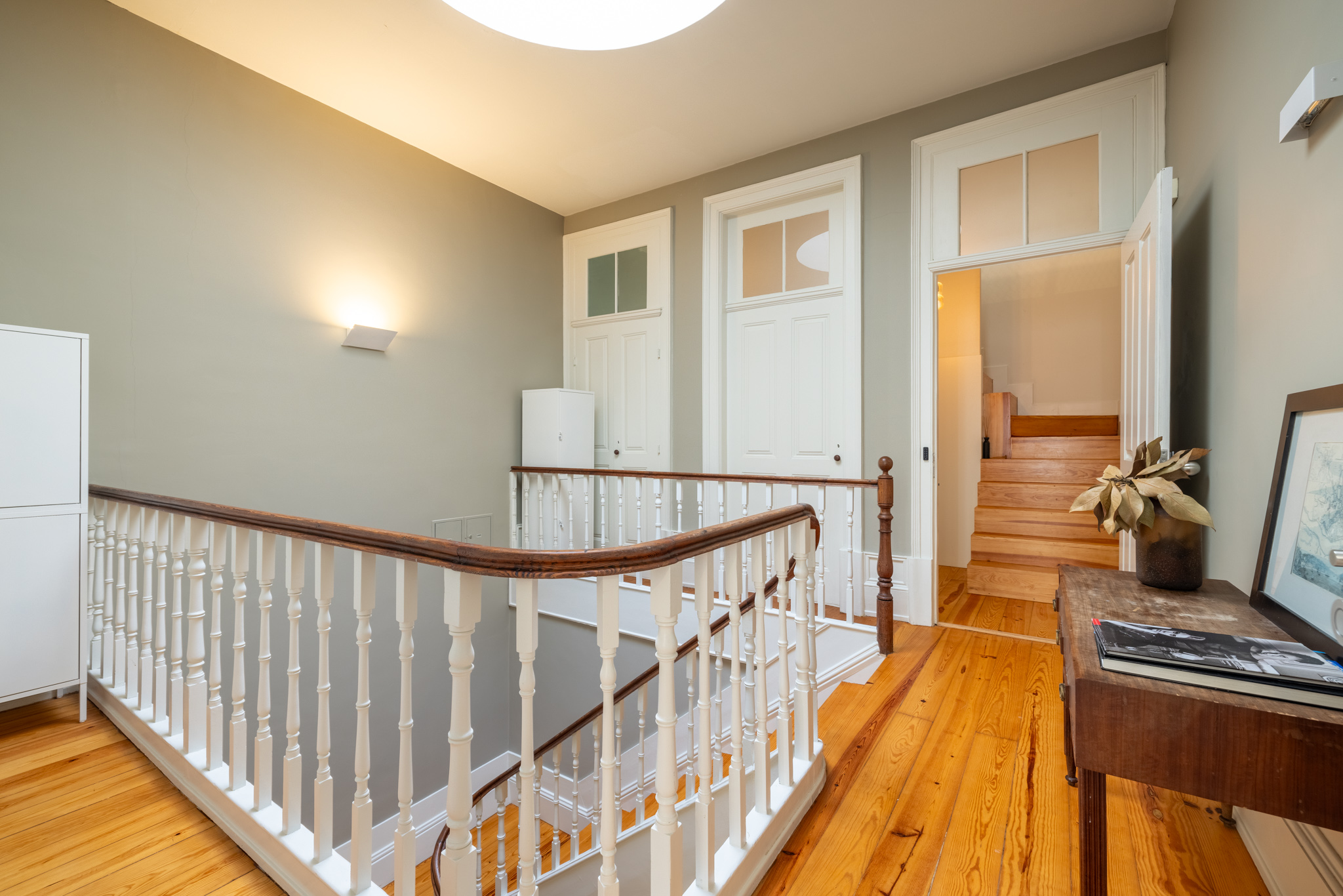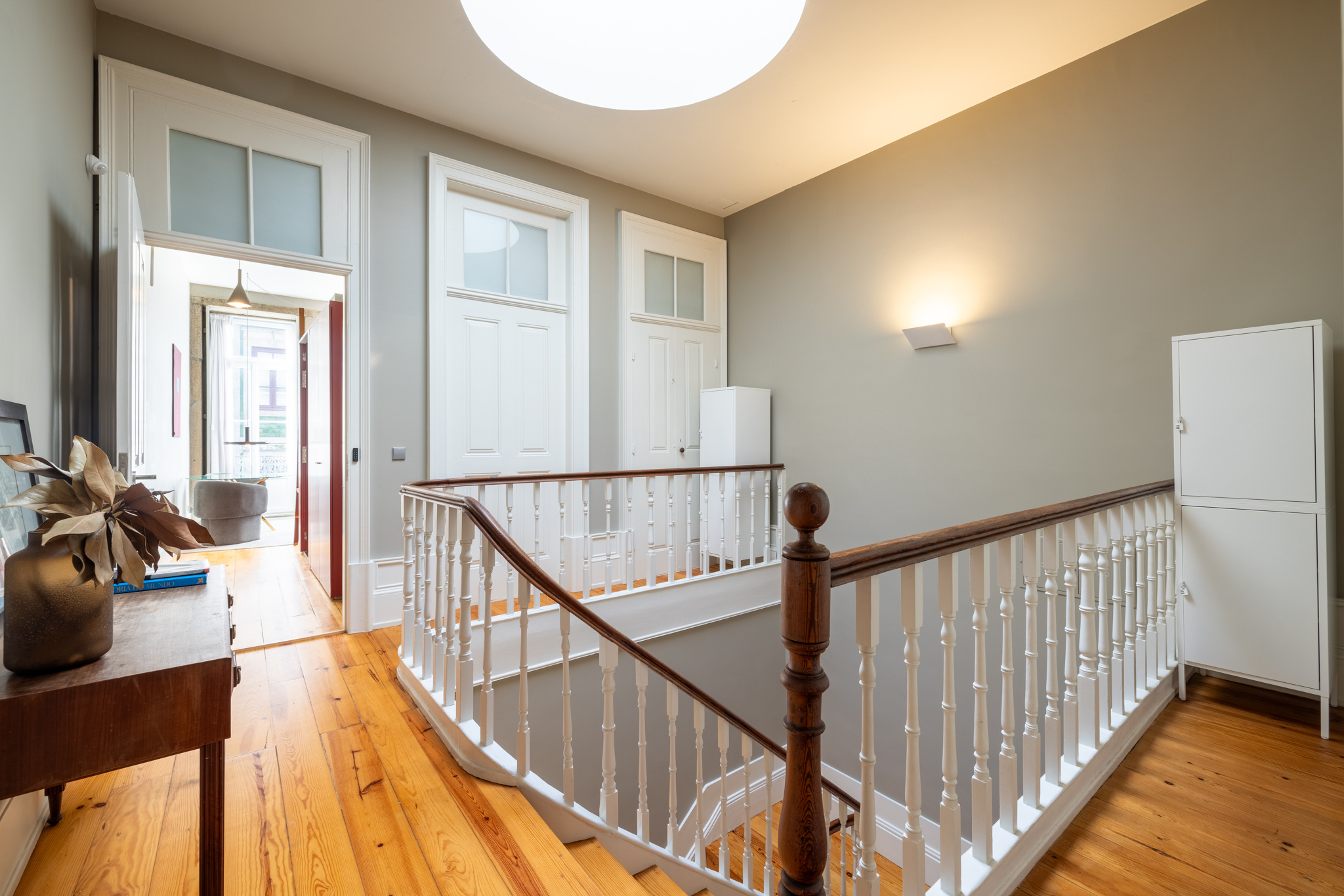 This isn’t just another modern building with a vintage look—it’s the real thing. Built in the early 20th century, it started as a bourgeois family home. Later, it became the offices and warehouse of the old Livraria Aviz, now known as Livraria de José Alves, just on the street corner. When we bought it, it needed serious work, but we preserved original features like stucco ceilings, elegant woodwork, and a charming skylight.